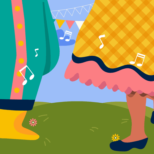 An animated couple dances Forró at a vibrant Festa Junina, surrounded by festive music notes.