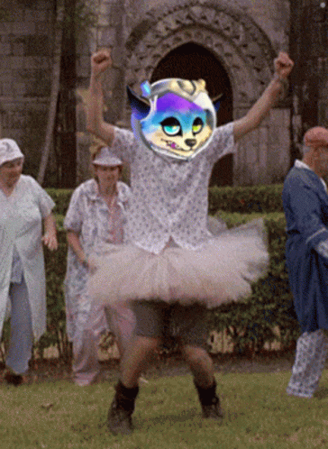 Person in a fox mask and tutu performs an energetic and crazy dance in front of an old building.