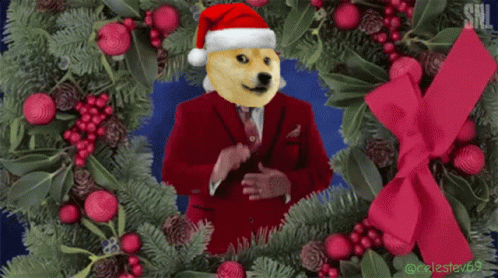 Doge meme in a Santa hat dances in a festive Christmas wreath, created by @celestev69.