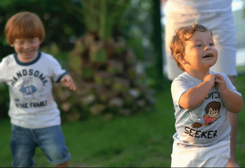Two young boys joyfully dancing outdoors in a grassy area, expressing pure happiness.