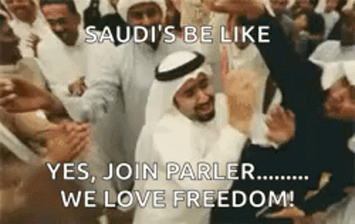 Saudi men in traditional attire are seen dancing, with captions 'SAUDI'S BE LIKE' and 'WE LOVE FREEDOM!'.