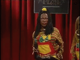 Martin, in a striped shirt, dances energetically on a stage with red curtains.