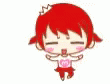 An adorable chibi cartoon girl with red hair and a heart on her chest joyfully dances ballet, jumping in the air.