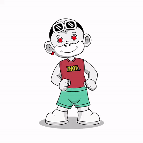A white cartoon monkey character with red eyes and sunglasses dances in a red ZHOTL shirt.