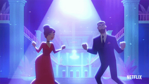 Carmen Sandiego and a male partner perform a synchronized dance routine in a grand hall, featuring Netflix logo.