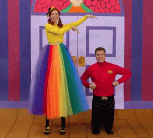 Emma Wiggle and Simon Wiggle from The Wiggles dancing in front of a colorful door.