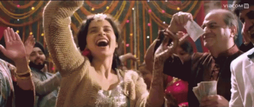 Kangana Ranaut, as Rani Mehra, joyfully dancing with arms raised at a vibrant festive party, celebrating with friends and family.