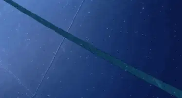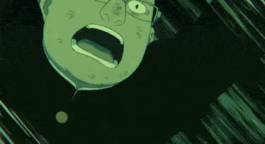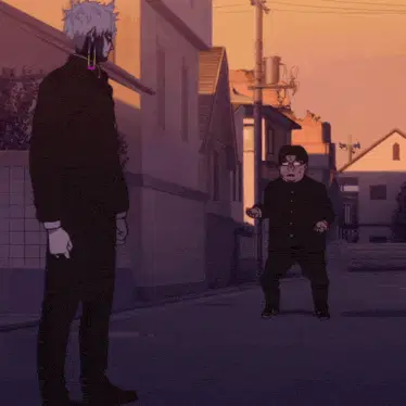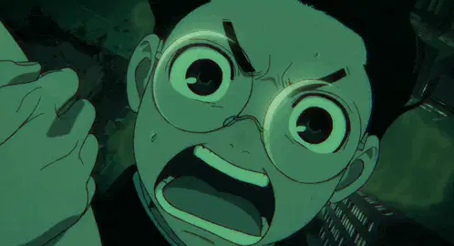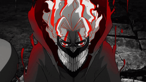 A powerful character from Dandadan, Okarun in his demonic form, with fiery white hair, red eyes, and a menacing toothy grin.