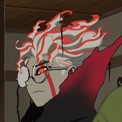 Anime character Ken Takakura (Okarun) with glasses, red and white hair, and a red mark on his face.