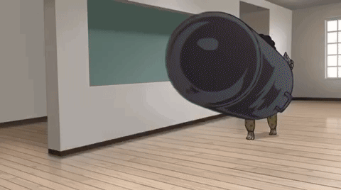 a cartoon character is standing in an empty room with a large trash can on his back .
