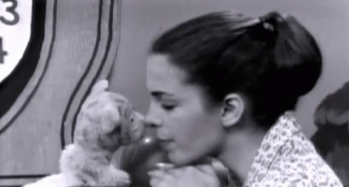 A woman affectionately nuzzles the Danie Tiger puppet, reminiscent of Mr. Rogers' Neighborhood.