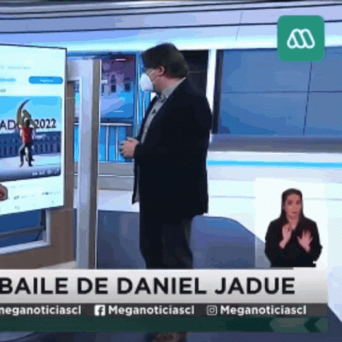 Daniel Jadue reacts to an animated dance of himself on a screen, with a sign language interpreter visible. From Meganoticias Chile.