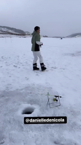 Danielle Denicola enjoys ice fishing in a snowy landscape, dressed in winter gear.