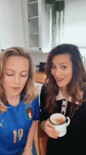 Danielle Savre enjoys Ringo cookies in an Italy jersey with Stefania Spampinato in a kitchen.
