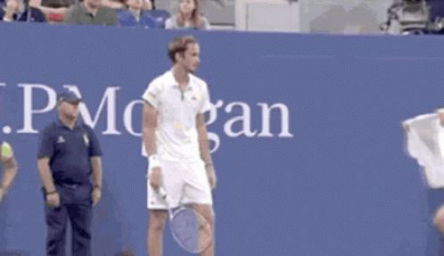 Daniil Medvedev's frustrated reaction during a tennis match, pulling a towel from a ball boy at the US Open.