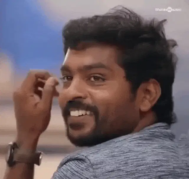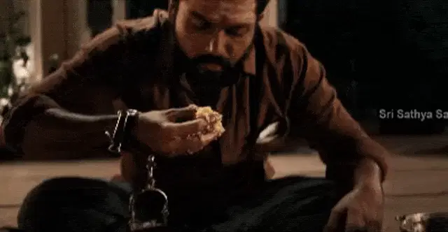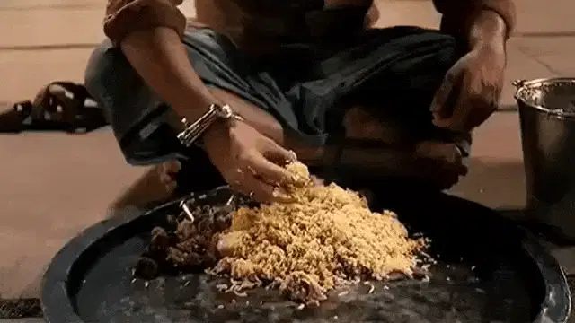 Riaz and a woman by a lake, Riaz playfully touches her face and asks if she wants to eat biryani.