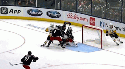 Danton Heinen scores a goal during a Pittsburgh Penguins hockey game.