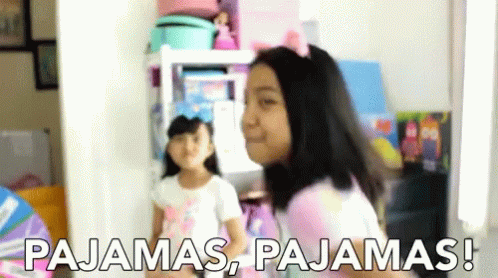 Keira Charma and another girl excitedly celebrate getting new pajamas, shouting 'PAJAMAS, PAJAMAS!'.