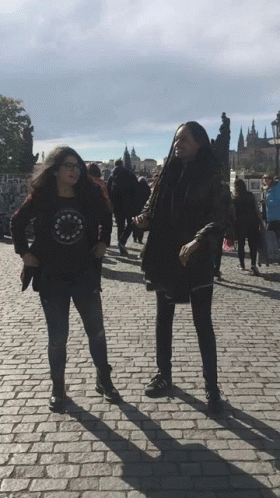 Two girls perform the dab dance move on the historic Charles Bridge in Prague, enjoying their travels.
