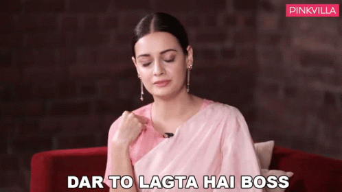 Dia Mirza, dressed in a pink saree, expresses 'Dar To Lagta Hai Boss' while sitting on a red couch during a Pinkvilla interview.