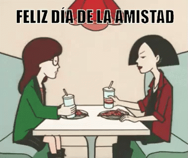 Daria and Jane celebrate Friendship Day, toasting with drinks at a table while enjoying pizza.