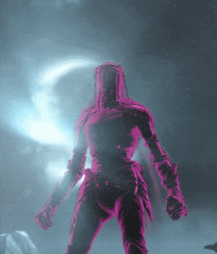 Purple phantom from Dark Souls 3 performs the 'point forward' gesture in a misty, dark environment.