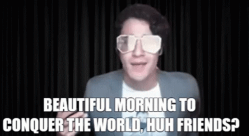 Darren Criss, wearing sunglasses and a suit, delivers the line: "Beautiful morning to conquer the world, huh friends?"