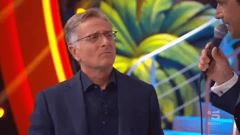 Paolo Bonolis from Ciao Darwin reacting with a shrug, embodying 'Darsi Delle Arie Eh Vabbe'.
