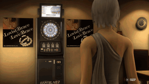 a woman stands in front of a dart board that says dartslive 2