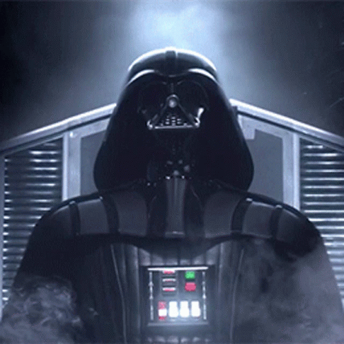 Darth Vader stands in a dramatic pose, surrounded by smoke and illuminated by a bright light.