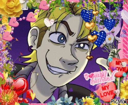 Dave Miller from Blueycapsules, depicted with a mischievous smile, surrounded by hearts and flowers.