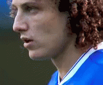 Close-up of footballer David Luiz looking focused and intense during a match, wearing his blue jersey.