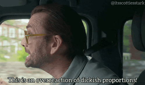 a man in a car with the words " this is an overreaction of dickish proportions "