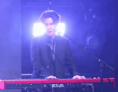 Wonpil from DAY6 passionately playing a red keyboard on stage under blue and yellow lights.