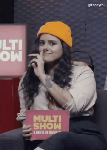 Daylimns Gifsdayrol makes a playful face and pokes her nose while holding a Multishow sign.