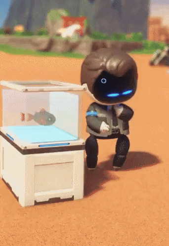 Astro Bot dressed as Dbh Connor interacts with a fish in a tank, mimicking a scene from Detroit: Become Human.
