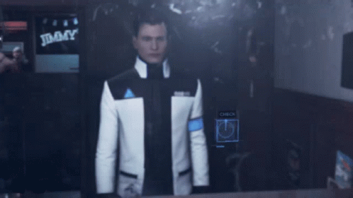 Connor, the android from Detroit: Become Human, stands in a room, reflecting on his mission.