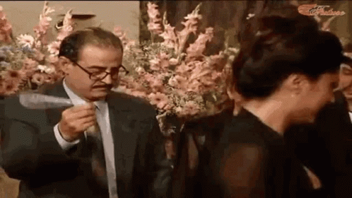 Man in suit holding a ceremonial knife at a Dabke event, surrounded by smiling guests.