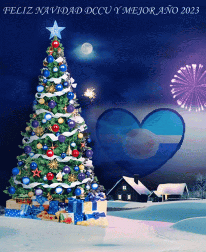 A festive Christmas and New Year greeting for DCCU, featuring a decorated tree, fireworks, and a heart graphic.