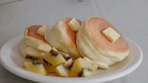 Fluffy Ddulgi soufflé pancakes topped with butter and syrup, served with fresh kiwi slices.