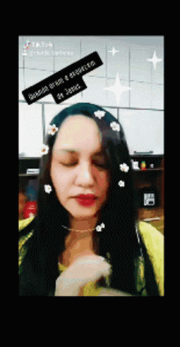 De Olho praying with hands clasped, wearing a yellow shirt and a flower filter in her hair, featuring a wink.