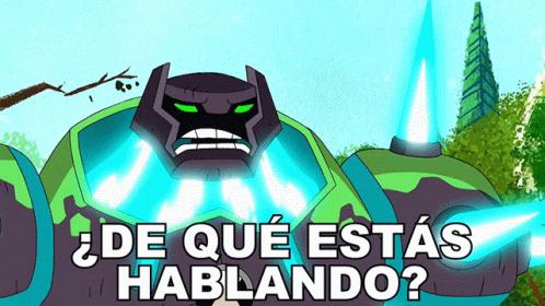 A Ben10 character, a large green and grey alien, asks '¿De qué estás hablando?' (What are you talking about?).