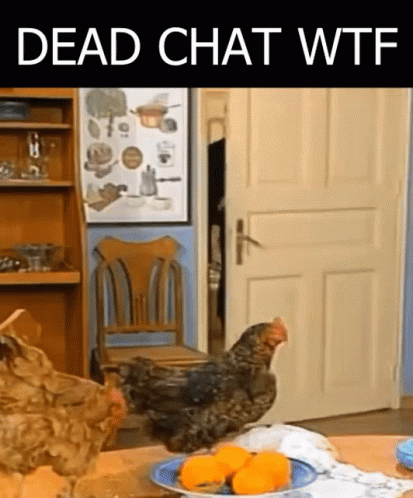 Katakouzinos reacts dramatically to chickens on a table with oranges, featuring the text 'DEAD CHAT WTF'.