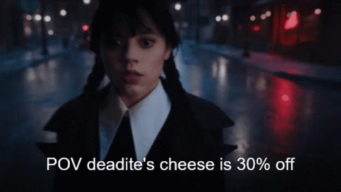 Jenna Ortega as Wednesday Addams reacts with wide eyes to the news that 'deadite's cheese is 30% off', then runs down a street.