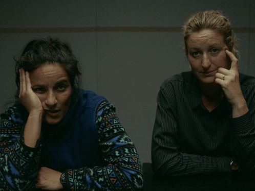Dulcie Collins (Madeleine Sami) and Eddie Redcliffe (Kate Box) look bored during an interrogation in Deadloch.