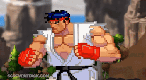 a pixel art of ryu from street fighter with screwattack.com in the corner
