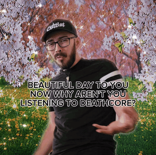 A man embodying the Deathcore Grandma meme asks why you aren't listening to deathcore on this beautiful day.