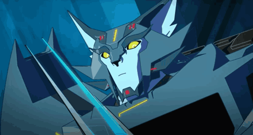 Animated Decepticon Steeljaw with glowing eyes and sharp features, holding a blue energy blade.