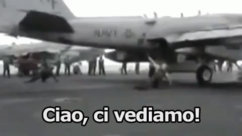 A military plane takes off from an aircraft carrier, followed by an unexpected incident and a farewell.