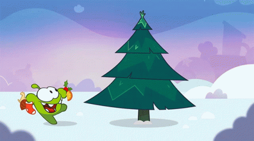 Om Nom joyfully decorates a Christmas tree with various ornaments, including a pinecone and a rocking horse.